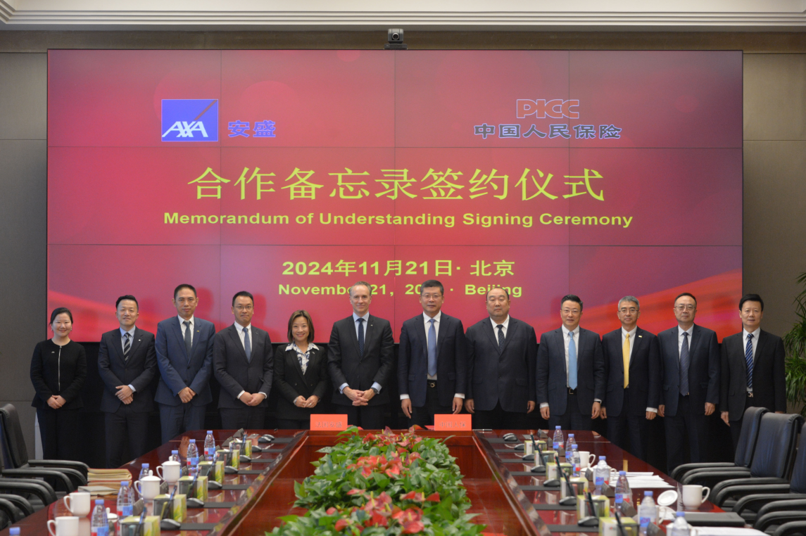 近日,法国安盛集团(AXA)与中国人民保险集团股份有限公司(以下简称:人保集团)在北京人保集团总部签署了合作备忘录。双方将基于各自优势,通过采取创新合作交流模式,在全球范围内深入探索国际合作、产品研发、技术创新,共同促进全球保险市场可持续健康发展。人保集团总裁赵鹏、人保集团副总裁兼人保财险总裁于泽、人保集团副总裁才智伟、人保集团合作部总经理张海军、人保集团保险部总经理彭钢、人保再保险总裁张青, 安盛集团首席执行官托马斯·布博 (Thomas Buberl)、安盛大中华区首席执行官尹玄慧、安盛天平财产保险有限公司首席执行官左伟豪、安盛天平总经理助理曾翔、安盛天平总经理助理兼总精算师殷兆男、安盛天平首席市场营销官戴思远等多位嘉宾莅临签约现场。
